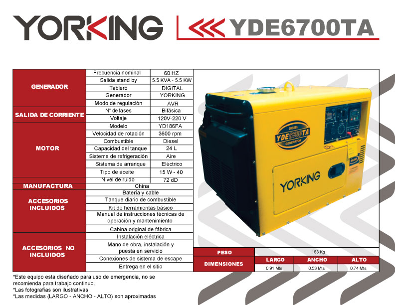 La Planta electrica YORKING 5500 W – YDE6700T – DIESEL, cuenta con salida bifasica 120V-220V. Esta planta electrica esta equipada en una cabina original de fabrica, lo que permite la minimizacion de ruido en el ambiente.